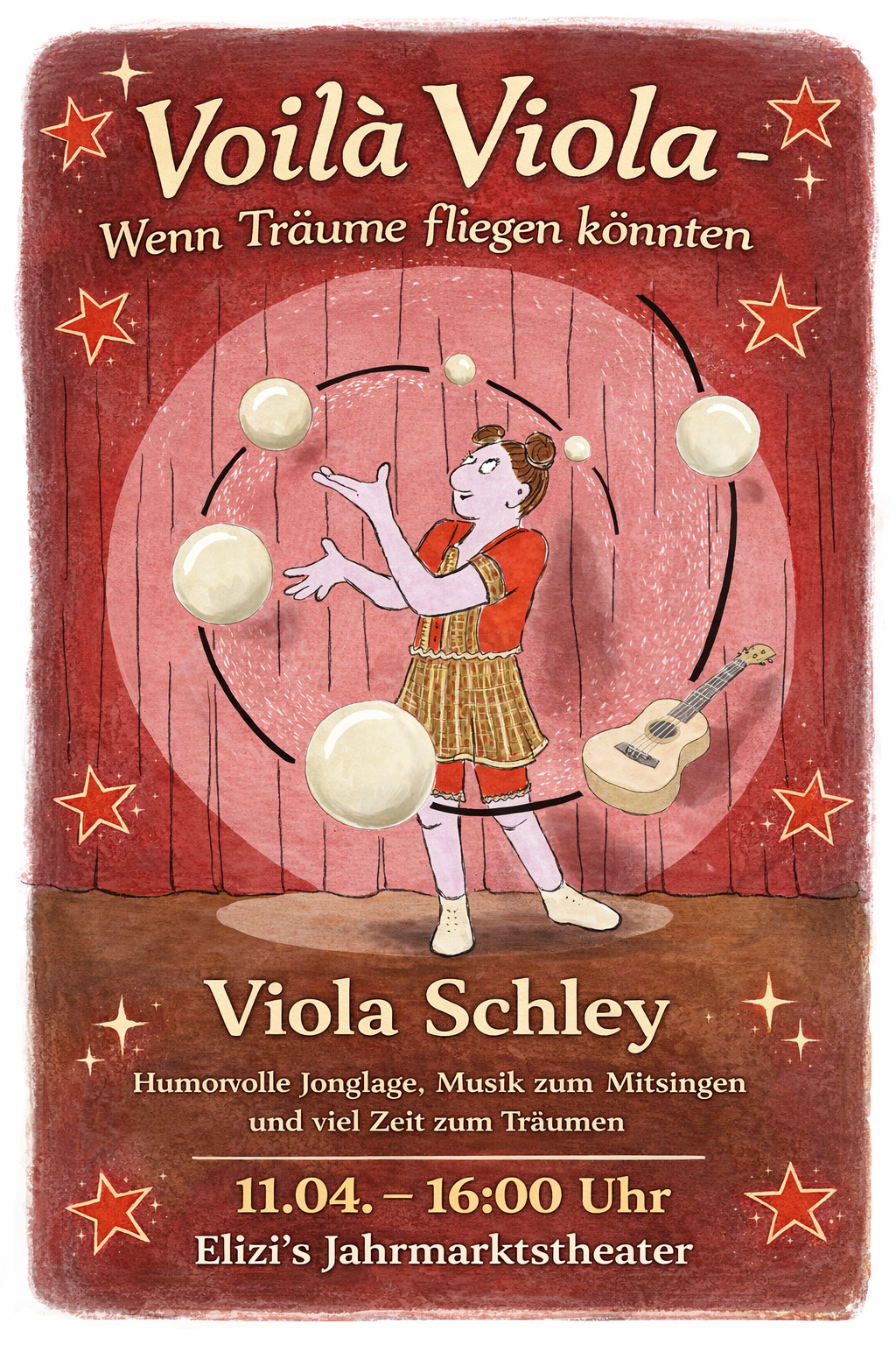 In ihrer Traumshow „Voilà Viola – Wenn Träume fliegen könnten“ entführt die Absolventin der "Staatlichen Artistenschule Berlin" das Publikum in eine fantasievolle Welt voller Jonglage, Musik und leuchtender Momente.